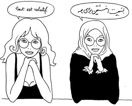 كان هناك في الماضي ترجمة (عشوائية) لكرتوني "كل شيء نسبي" حول النسبية الخاصة. تم استئجار النسخة الوحيدة من هذا الكرتون من عندي منذ 25 عامًا. لو استطاع أحد أن يرسل لي ملفًا بصيغة PDF يحتوي على صفحات ممسوحة، فسيمكنني من إتاحة هذا الألبوم للقراء الإيرانيين. لتقديم توضيح، فإن الألبوم متوافق مع التعليمات الدينية المحلية، حيث تم تزويح البطلة سويفي بحجاب، وسراويل واسعة، وملابس تغطي جسدها وتجعل صدرها الشهير غير مرئي للعيون. أدناه، الصورة على اليمين، صورة مأخوذة من إحدى الصفحات النادرة التي تمكنت من الاحتفاظ بها.