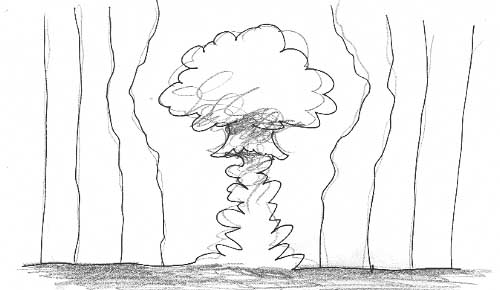 Hervorhebung der atmosphärischen Effekte einer atomaren Explosion durch eine vorherige Markierung (Raketenstarts)