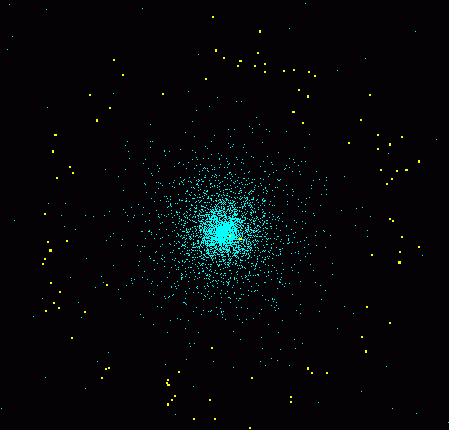 Imaginons que je veuille modéliser un "amas globulaire" en 3d. Voir la photo de l'amas d'Hercule, plus haut. Je n'aurai pas la possibilité de gérer des centaines de milliers de points-masses, mais quand même quelques milliers. J'ai la chance de pouvoir disposer d'une solution analytique (celle d'Eddington) qui me permet de préciser au mieux les positions initiales et les vitesses des points-masses. Mon but est d'étudier la dispersion, "l'évaporation" naturelle de l'amas. Je constate qu'il s'évapore rapidement, à un rythme qui me paraît trop rapide. J'isole alors un point masse et je regarde comment il se comporte dans l'amas. Je constate qu'il a une trajectoire en zigzag qui traduit abondance de "collisions", de rencontres proches et je sais que ces rencontres vont peupler "les queues de distributions des vitesses", donc doter des points masses de vitesses excédant la vitesse de libération de l'amas. Alors .. c'est normal. Mais ça n'est pas ce que j'aurais voulu faire. Je peux alors artificiellement réduire l'effet de ces rencontres rapprochées en annulant purement et simplement l'interaction quand les deux points-masses sont à une distance inférieure à une distance donnée.