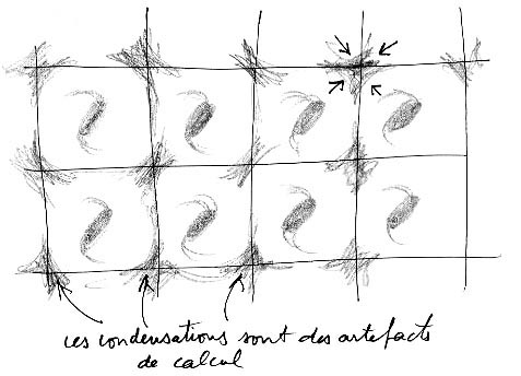 Ces condensations étaient liées au pavage, au fait que le système gérait "une infinité de galaxies voisines". Je crois que c'est un joli exemple d'artefact. A tout moment nous serons obligés de nous dire : est-ce que ce que nous voyons correspond à quelque chose de "réel", peut se référer à une réalité où est-ce que c'est un artefact lié à la façon dont on gère le calcul. Les sources d'artefacts peuvent être très variées. Doit être considéré comme un artefact tout ce qui nous fera nous éloigner de la dynamique réelle du système étudié. Un artefact peut faire :