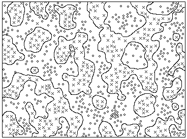 Pour terminer ce court chapitre sur les artefacts on gardera en tête que quand on aura l'impression de dégager un phénomène, avant de crier victoire il faudra effectuer un certain nombre de tests. Un des paramètres importants est le pas de calcul Dt. Comment le "régler" ? Empiriquement, on pourrait dire que le pas est suffisamment faible quand, en le réduisant, on ne change plus, grosso-modo, l'allure du calcul. Quand nous avions fait les premiers essais avec 500 points-masses, Pierre Midy et moi, en 1991, en utilisant "un vieux Cray1", celui d'Orsay, nous avions utilisé un logiciel qui adaptait son pas de calcul pour éviter "les lignes brisées. Le programme testait à chaque pas la variation angulaire des trajectoires de tous les points. S'il se produisait quelque part une rencontre de proximité et que le long d'un pas, la trajectoire subissait des cassures trop prononcées, le logiciel stoppait tout, revenait un pas en arrière et reprenait le calcul avec un pas dix fois plus faible. D'où un accroissement du temps de calcul. A chaque fois que cela se produisait c'est comme si la machine disait "attention ! deux points se frôlent. On effectue un calcul précis. Pendant ce temps-là tout le monde attend". J'ai alors suggéré à Midy ce Cut In, cette annulation de la force lors d'approches trop prononcées. Ca a marché au sens où le résultat obtenu, avec un temps de calcul dix fois plus petit était qualitativement comparable. Il s'agissait de simuler le phénomène de percolation de matière et de matière gémellaire. Nous en avons déduit que nous pourrions procéder ainsi. Ci-après :