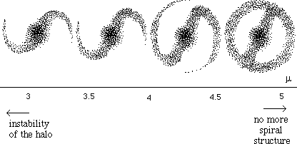 Lire cette étude dans cet article, qui fut refusé par de nombreuses revues et donc jamais "publié". Je crois en fait que personne ne voulut croire à de tels résultats. A l'époque, 1992, j'avais montré cette animation aux "spiral women" françaises : Lia Athanassoula et Françoise Combe. Cette dernière m'affirma "qu'avec du gaz froid on obtenait exactement la même chose". Mais c'était faux. Il ne s'agissait que d'une intox : ses galaxies spirales ne tenaient pas plus d'un tour. Celles d'Athanassoula non plus (qui finit par se détourner du sujet, en dépit des puissants moyens de calcul dont elle disposait, faute d'idées).