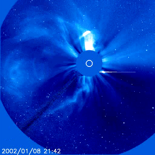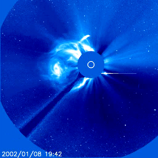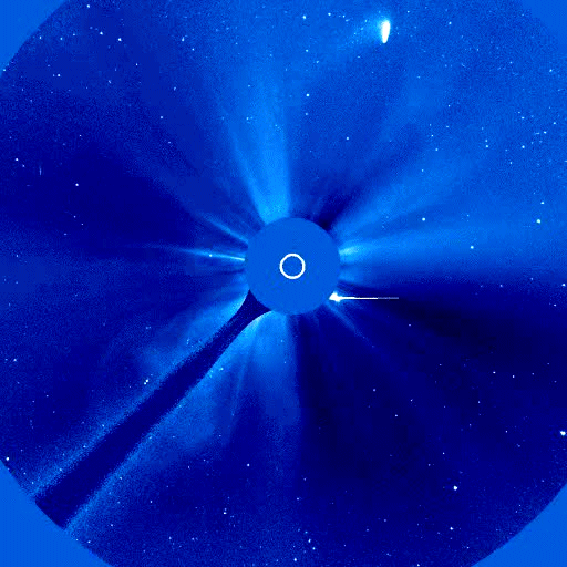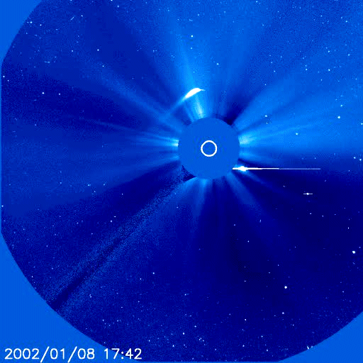 qui est celui de Jim Mac Canney, lequel montre d'intéressantes vidéos se référant à des passages de comètes à proximité du Soleil. Ces images sont prises à l'aide d'un coronographe, dispositif simple où l'image du Soleil est occultée par un disque fixé au bout d'une tige (visible). On distingue alors la structure de la couronne solaire. Une comète représente une masse très faible à l'échelle de celle du Soleil. Celle de Halley a les dimensions d'une colline et est moins massive. L'effet gravitationnel, l'effet de marée peut donc être considéré comme assez négligeable. Par contre la comète, en approchant du Soleil, traverse un vent solaire très intense. On peut penser alors qu'elle acquiert une charge électrique importante. Dans le film on pourra voir, au moment où la comète se trouve très proche du Soleil, qu'une éruption Solaire de grande intensité se manifeste. On peut penser que le déclencheur pourrait être de nature électromagnétique. Voici d'abord quelques images extraites du film :