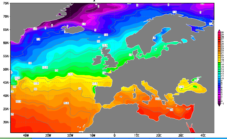 Distribution des températures océanes à l'ouest de l'Europe le 14 octobre 2005