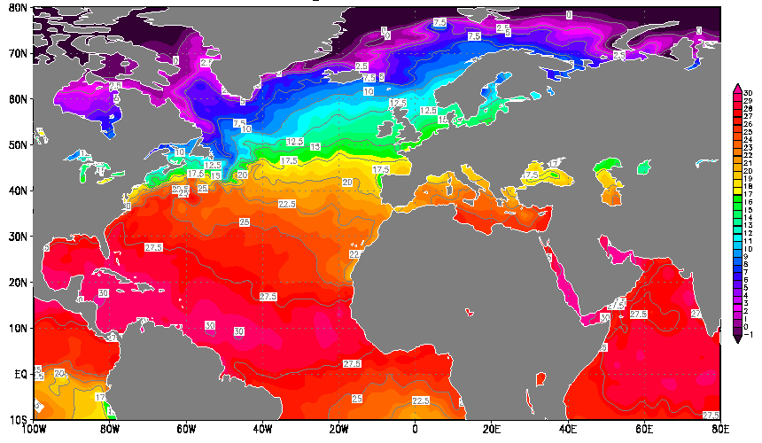 Les cyclones se forment au dessus des eaux chaudes et en principe quand celles-ci atteignent une températire-seuil de 26°C. En ce milieu du mois d'octobre 2005 un cyclone de type tropical, dont l'intensité ( niveau 1 ) est évidemment sans commune mesure avec celle des deux cyclones qui ont frappé le sud des Etats-Unis s'est formé au milieu de l'Atlantique, le 9 octobre et a atteint de Portugal le 11. Il n'en est résulté que des vents violents et de très fortes pluies.