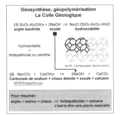 Peut-on recréer des pierres véritables en reprenant le long travail effectué par la nature. La pétrification ( de petra, la pierre ) est un phénomène de métamorphisme. S'agissant du calcaire, des coquillages forment des sédiments. Puis ceux-ci subissent pendant des temps très longs une forte pression et se transforment. Selon le temps écoulé on trouvera tous les stade de cette évolution naturelle. Inversement le calcaire est soluble dans l'eau. C'est ce qui donne les rivière souterraines, les reliefs karstiques, qui ne se forment pas par érosion mais principalement par dissolution. Sur le plateau de Giseh il existe différents filons calcaires, correspondant à différents états de transformation, de métamorphisme. Davidovits a montré que l'un d'eux se prêtait aisément à une désagrégation en milieu aqueux. D'où sa thèse. Pour transporter des masses calcaires imposantes, une solution consiste à les désagréger d'abord. On transporte alors ce matériau pulvérulent dans de simples couffins. Reste ensuite à réagglomérer le tout. Davidovits fait, à la fois dans son livre et dans la vidéo figurant ci-dessus la démonstration de la faisabilité de cette opération. Voir ce schéma extrait de son livre, page 58.