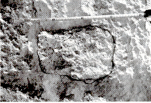 J'ai visité la Grande Galerie de la pyramide de Khéops. On y trouve des blocs de vingt tonnes dont les plans de joints ne permettent même pas d'y glisser ... une lime à ongle. Il faut le voir pour le croire. L'assemblage ( dans des plans aussi bien horizontaux que verticaux ) est de l'ordre du dixième de millimètre. Pourquoi ? Mécaniquement, ça n'a aucun intérêt. Dans des plans horizontaux, cela se comprendrait ( pour éviter tout glissement ), mais dans des plans verticaux, non. Alors ? Ces blocs auraient-ils été moulés ? Sinon, comment aurait-on pu réaliser des assemblages aussi parfaits ? J'avoue être resté bête devant un tel constat. On en finirait plus de recenser les bizarreries, constatables de visu, que le visiteurs pourra trouver sur le site de Giseh. Il y a des blocs énormes qui reposent l'un sur l'autre selon des plans de joints qui ne sont pas horizontaux. Ci-après ( ouvrage de Davidovits, page 29 ) une "inclusion de calcaire" dans la pyramide de Kephren :