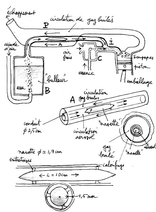 On a pris une configuration associée à un moteur à essence, mais le système diesel n'est pas différent dans son principe. J'ai pris des notes. S'il y a des erreurs, sur les cotes, par exemple, ceux qui m'ont montrés leurs réalisations à Mérindol, les rectifieront. Il est à noter que dans le schéma initial du brevet de Paul Pentone on se réserve le droit d'opérer un ajout de carburant dans l'eau du bulleur.