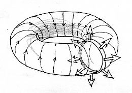 La physique des plasma peut se prêter à toutes les géométries possibles et imaginables et, au sein de tels dispositifs des tas de phénomènes peuvent se produire, plus ou moins bien connus et maîtrisés, du reste. Tout à l'heure nous avions envisagé une spire unique. Mais nous pouvons aussi bien imaginer un ensemble de spires agencées selon un tore : un montage du style tokamak. On imaginera aisément que si on disposait des spires de fil électrique sur une envelope souple, comparable à une chambre à air, constitué par un tissu isolant, le passage du courant "gonflerait" celle-ci. Là encore, le passage d'un courant trop intense pourrait entraîner l'éclatement. Les sytèmes de magnétisation de tokamak sont ainsi soumis à des contraintes mécaniques et doivent être solidement bridés.