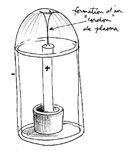 Quand cette ombrelle de plasma se trouve expulsée hors du cylindre, il se forme un cordon de plasma qui la retient un bref instant à l'anode :