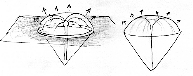 Comme dans le "plasma rail gun" on peut imaginer que dans cette géométrie torique de la nappe de courant une partie soit "libre d'entrer en expansion". On obtiendrait par exemple le schéma de l'ionisateur pariétal ( en forme de piège à loup )