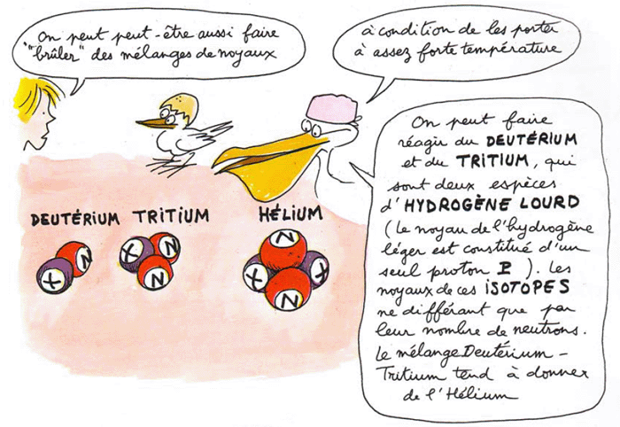 Leur fusion, intervenant quand la température atteint cent millions de degrés ( à un rythme rapide ) produit un noyau d'hélium et un neutron ( rapide ) doté d'une énergie de 14 Mev ( 14 millions d'électron-volts ). Au coeur du soleil la température de la "chaudière" n'est que de 15 à 20 millions de degrés et la fusion ne s'y déroule qu'à un tythme beaucoup plus lent ( sinon le Soleil exploserait ).