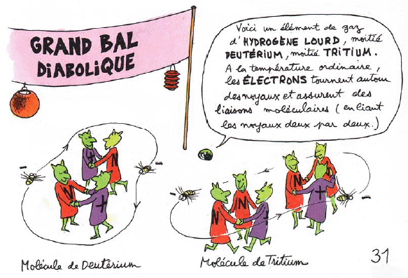 A gauche, une molécule D - D et à droite une molécule T - T . La liaison est assurée par des électrons, ici représentés par des abeilles. Les "nucléons" sont figurés par des diablotins. Les protons, électriquement chargés sont en violet, les neutrons, électriquement neutres, en rouge.