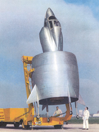 | forme d'un unique prototype, qui fut malheureusement détruit aux essais, après avoir atteint 900 mètres d'altitude. L'idée émanait au départ d'un Allemand : Von Zborowski. Il s'agissait de l'une des "armes secrètes" avec lesquelles Hitler avait espéré, à la fin de la guerre, reprendre l'avantage. Comme les bombardiers alliés endommageaient régulièrement les pistes d'envol, les biréacteur Messerschmidt 262, nécessitait une forte longueur au décollage, était souvent cloué au sol. L'aérodyne de Zborowski, à décollage vertical, aurait ainsi résolu le problème. Les Français récupérèrent ce transfuge Allemand, de même que les Américains récupérèrent Von Braun à Penmünde. Une machine conforme à ses idées fut étudiée et construite autour d'un turboréacteur : "l'ATAR volant", assez puissant pour permettre l'envol vertical. En vol horizontal, il était prévu que l'aérodyne de Von Zborowski puisse, après injection de kérosène dans l'espace entourant le moteur, fonctionner en "stato-réacteur", ce qui lui aurait alors permis d'atteindre mach 3. La destruction du prototype fut une malchance, car ce type d'appareil aurait pu donner naissance à toute une génération de chasseurs absolument révolutionnaires. Actuellement le seul appareil à décollage vertical qui soit opérationnel est le Harrier Britannique (le harrier est un chien Anglais utilisé pour la chasse en meute). |