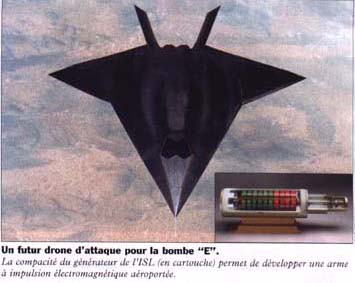 On sait également que la France poursuit le développement d'une arme électromagnétique dont un prototype de faible puissance, mis au point à l'institut Franco-Allemand de Saint-Louis est déjà opérationnel. Cette arme de petite taille (10 cm de diamètre sur 40 cm de long) est censé équiper un "drone de combat".