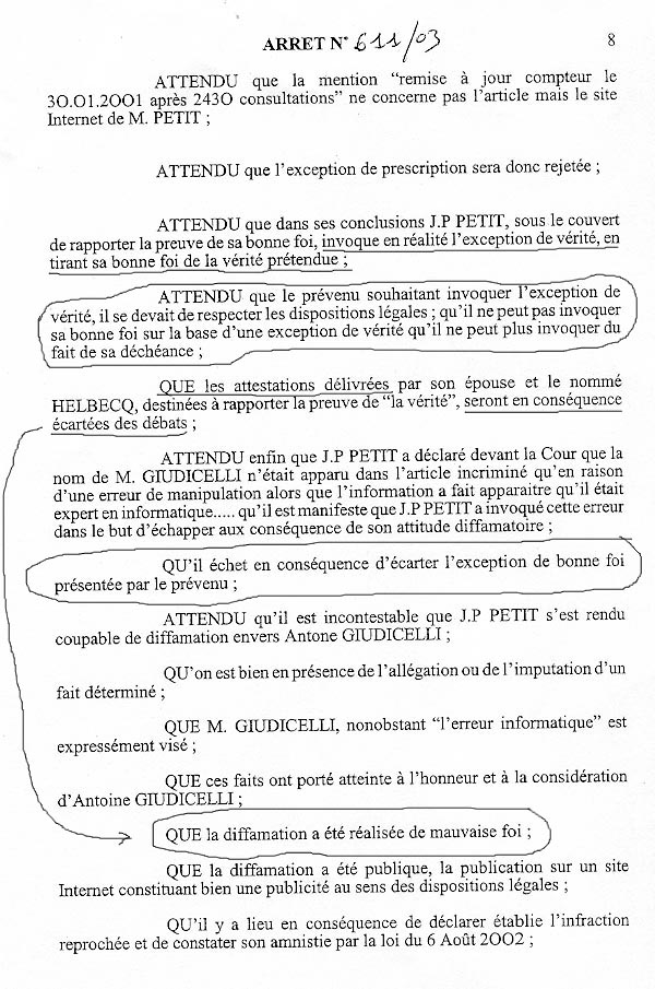 C'est évidemment dans le second cadre que nous nous étions situés lors des deux procès, en première instance et en appel. Les pièces, les deux témoignages, qui confirmaient mes dires mot pour mot ont été ainsi communiquées à la Cour en première instance. Elle l'ont également été en Appel. Mais la Cour, cette fois, a estimé que ma défense aurait du se situer dans le cadre de l'exception de vérité. Comme les pièces n'avaient pas été transmises dans les règles dans les dix jours suivant la signification la Cour considéra que mes deux témoignages, de même que toute autre pièce communiquée seraient "exclues des débats". Je fus alors "déchu du droit de faire la preuve" comme quelqu'un qui n'aurait rien fourni pour appuyer sa défense, et condamné à payer 5500 euros de dommages et intérêts à M. Giudicelli.