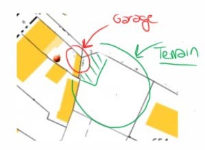 Voilà le fameux terrain en tant de parcelle cadastrale. Une faible partie du terrain suffirait à produire due extension du terrain de 60 mètres carrés. On attend le propositions du propriétaire pour en faire état.