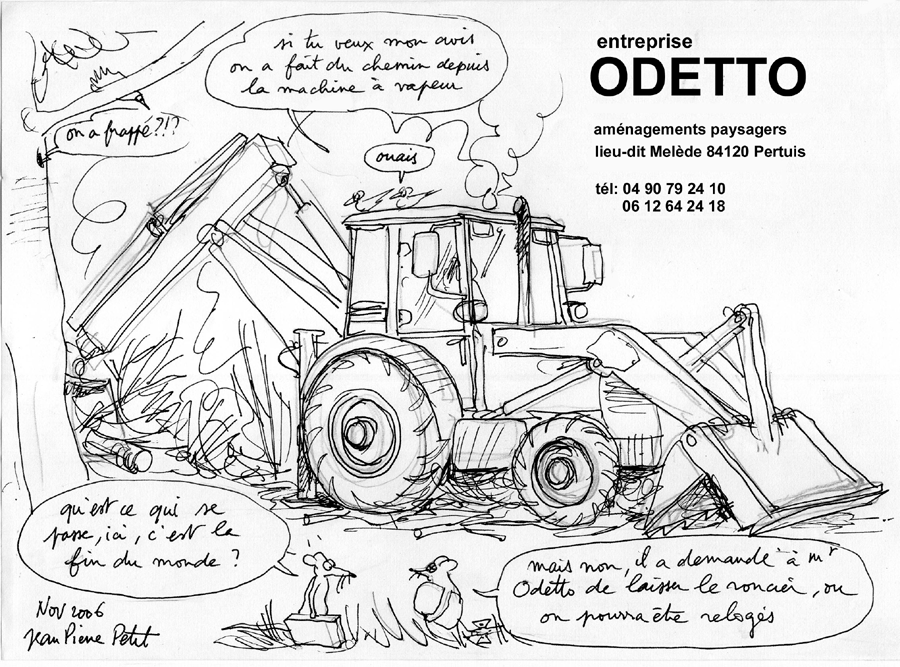 J'ai des superbes peupliers en bordure de propriété, qui envoient des surgeons à vingt ou trente mètres. L'un d'eux faisait 10 cm de diamètre. Il faut dire que la nappe phréatique est à quelques mètres en dessous. Arracher cela à la main était devenu impossible, surtout avec une sacro-lombaire en trois morceaux, qui tiennent ensemble par l'opération du Saint-Esprit. . J'ai donc fait appel à un pro, qui est arrivé avec un truc évoquant Goldorak. Il opère à l'intérieur d'une cabine vitrée avec un siège pivotant, selon l'outil qu'il contrôle. Avec le bras, a en plus une partie téléscopique, il arrache des arbres. Puis la scrouncheuse, visible à droite, fait le reste. Il est ensuite venu avec un rototracteur et en une heure mon terrain ressemblait à du chocolat Meunier. L'herbe folle repoussera vite.