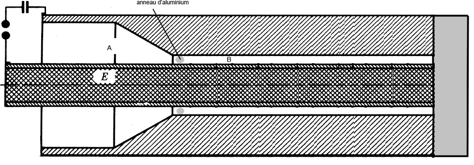 Revenons à la thèse de Bavay. Nous allons reconnaître des éléments du montage ci-dessus, constitués différemment. Comme nous l'avons dit, les deux liners sont "à fils" et se transformeront en plasma. Il faut que soit créée une certaine pression magnétique dans l'enceinte A avant que celle-ci ne soit fermée. Il reste à remplacer l'élément propulseur, le gaz issu de l'explosion par une pression magnétique. Nous pbtenons alors ceci :