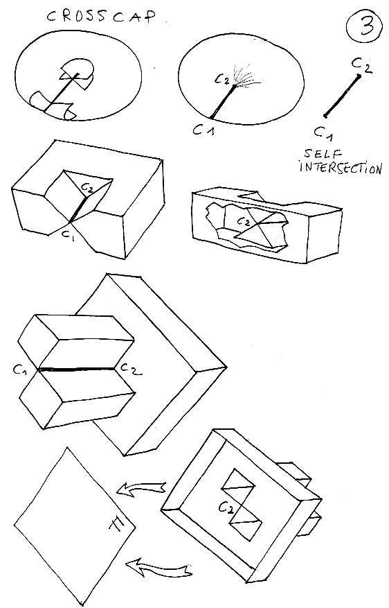 Si on étend la règle du jeu en supposant que ces objets possèdent des points cuspidaux on obtient des submersions (la Cross Cap, la Surface Romaine de Steiner). je ne sais pas si c'est le mot exact, mais comme je n'au trouvé aucun matheux qui puisse m'éclairer j'ai trouvé amusant d'en inventer un, provisoirement, jusqu'à ce qu'un géomètre-expert ne se manifeste. Ainsi la Cross Cap et la Surface Romaine de Steiner seraient des submersions du "plan projectif".