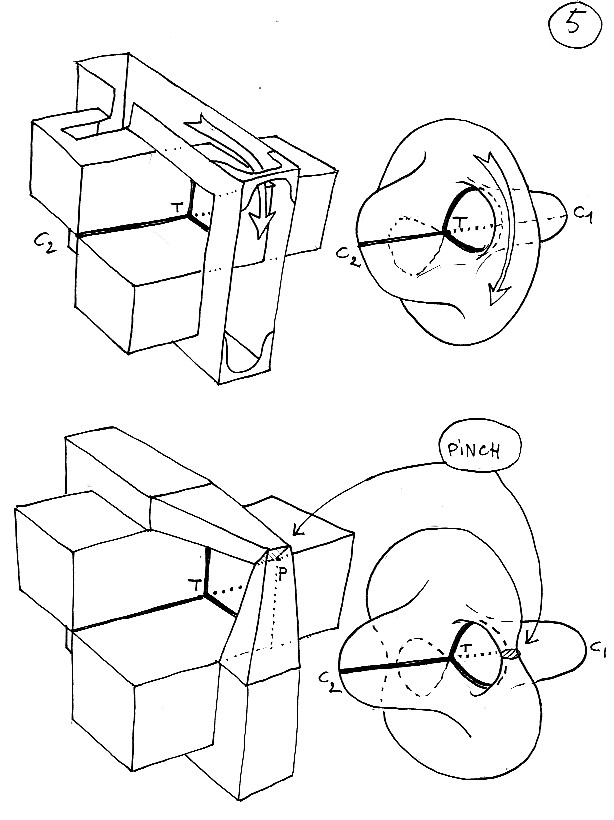 Dans cette planche 4 se situe le moment le plus difficile à appréhender. Il me paraît à peu près impossible que le premier venu comprenne ces figures en regardant simplement les dessins. Construisez ces maquettes. En clair on tire le point cuspidal C2 vers "l'intérieur de la surface" (ce qui n'a au passage aucun sens puisque, vous l'aurez sans doute remarqué immédiatement, la Cross Cap est unilatère. En insistant la surface s'auto-traverse et l'ensemble d'auto-intersection se complète, en "rondouillard" par une courbe en forme de 8. Il se crée au passage un point triple T.