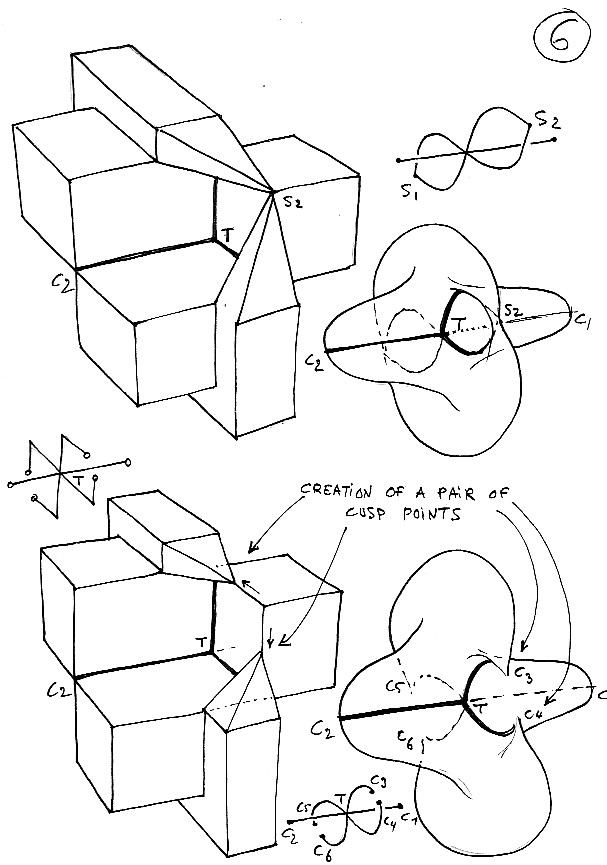 Planche 6 : le pincement est effectué en créant un point singulier B. En fait comme on pince des deux côtés, histoire de gagner du temps; il se forme deux points singuliers S1 et S1 puis deux paires de points cuspidaux. Là, sans bristol, ciseaux et ruban adhésif, vous êtes mal.