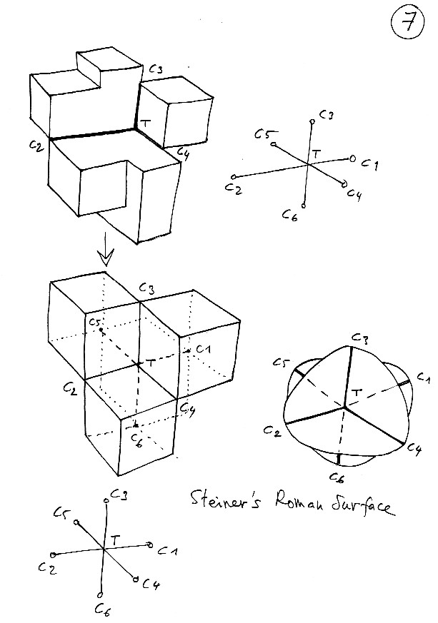 La surface est plus compréhensible sous sa forme polyédrique et, en bas, nous avons grossi certains éléments pour montrer ce qui nous incite à transformer cet objet en Surface Romaine de Steinder (voir la réalité virtuelle) dont la forme polyédrique la plus simple consiste à assembler quatre cube (ici on n'en voit que trois).