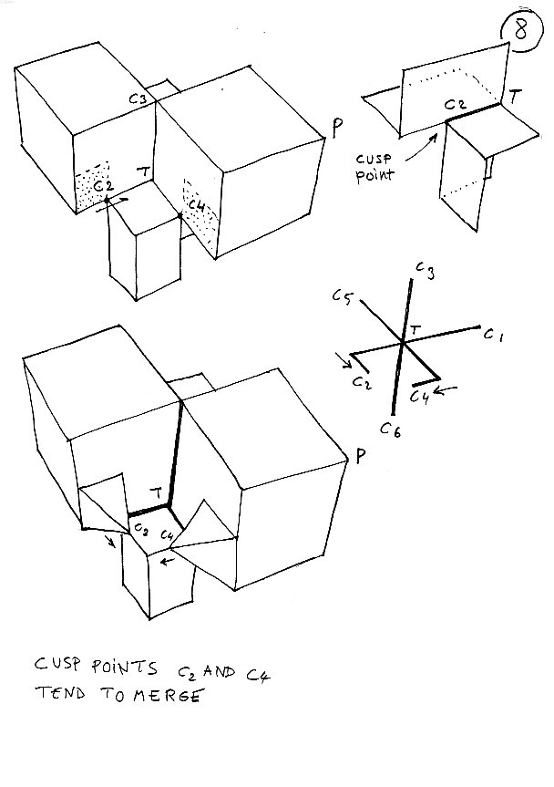 Planche 8 : On commence par faire migrer deux points cuspidaux (C2 et C4) qui se rapprochent du point triple T. On a alors déposé des pointillés sur des portions de la surface que l'on va "défoncer de l'intérieur" avec un "poinçon pyramidal (de grâce, construisez ces modèles sinon vous êtes bons pour l'hôpital psychiâtrique. En se développant les pointes de ces pyramides ne sont autres que les points cuspidaux C2 et C4 qui "migrent" et vont se rejoindre.