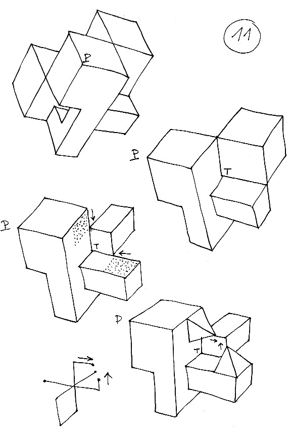 Planche 11 : on tourne cet objet pour le voir sous un autre angle et on fait migrer deux nouveaux points cuspidaux, puis on défonce les parties pointillées "de l'intérieur" (ce qui est idiot puisqu'une surface Romaine de Steiner, surface du 4° degrés )est unilataire). On continue cette migration-concfluence de cette seconde paire de points cuspidaux.