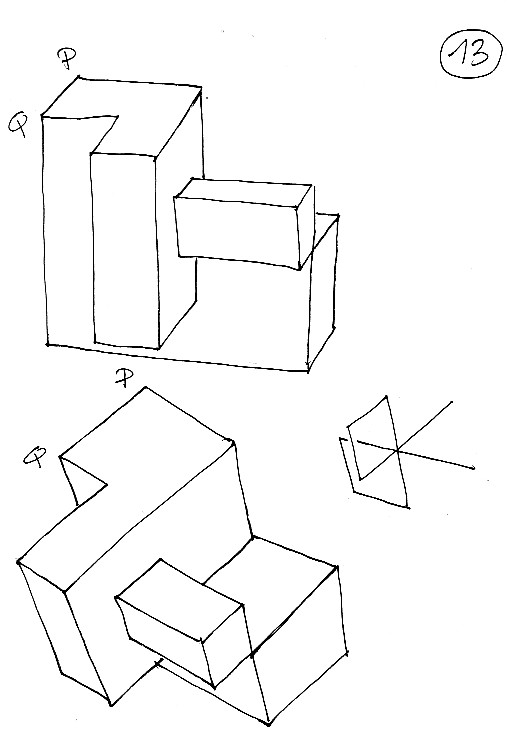 Planche 14 : On réédite la même opération en créant la troisième "oreille" de la courbe d'auto-intersection. En polyédrique celle-ci a la forme de trois carrés ayant un sommet commun : le point triple T .