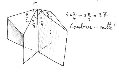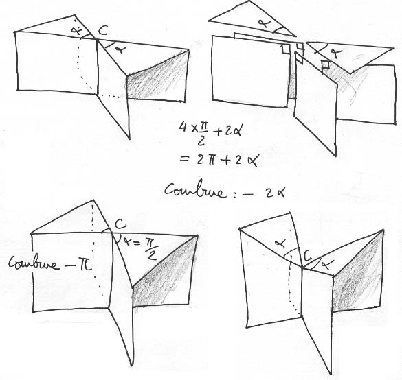 En haut et à gauche on a fait figurer une des multiples représentations polyédriques du point cuspidal. Le "démontage" de l'objet (à droite) conduit à une somme excédant la somme euclidienne 2 p d'une valeur 2 a . On en déduire que la courbure angulaire concentrée au voisinage de ce point C est - 2 a. Si l'angle a est égal à p/2 alors la courbure négative vaut **c **(figure en bas et à gauche). En fait la courbure concentrée en un point cuspidal peut prendre une infinité de valeurs. En bas et à droite on accentue la somme angulaire et la courbure devant alors < 2 a. On accentue la courbure négative.
