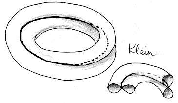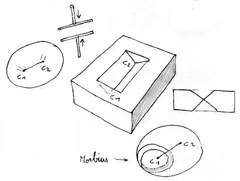 Comme on peut y inscrire un ruban de Moebius cette surface est unilatère. On a fait figurer sa représentation polyédrique qui permet de calculer sa courbure totale. On trouve alors zéro. Si je ne m'abuse ce serait alors une bouteille de Klein. On ne connait en général que l'immersion la plus classique où la ligne d'auto-intersection est un simple cercle. Mais il y en a d'autres, comme celle-ci. J'avoue que je n'ai pas encore trouvé comment transformer l'objet ci-dessus en une immersion de la bouteille de Klein. Je ne sais d'ailleurs si les différentes immersions relèvent du même groupe d'homotopie (la sphère n'en a qu'un). A priori non, puisque le tore peut être immergé de quatre manières différentes, qu'on ne peut relier entre elles par une homotopie régulière. En attendant je me suis amusé à transformer cette surface en créant deux points cuspidaux supplémentaires et on obtioent alors Deux Cross Caps reliées par un tube. En les découposant on retrouve une caractéristique d'Euler Poincaré égale à zéro.
