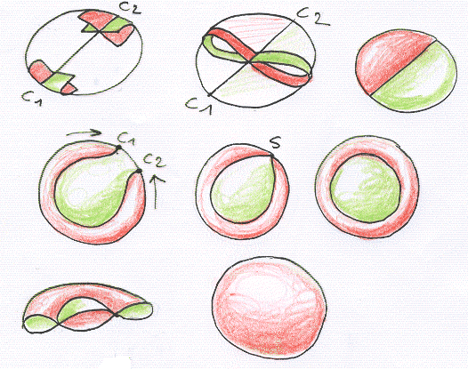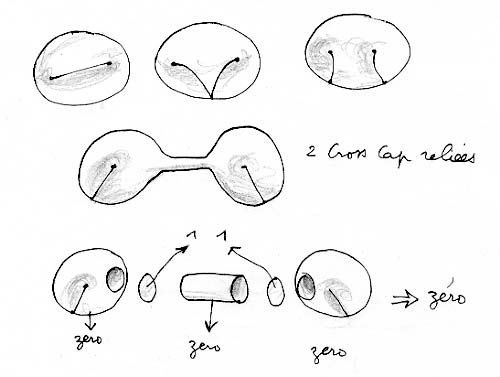 Au cours de ma conférence j'ai évoqué l'art et la manière de permuter les deux points cuspidaux d'une Cross Cap, en utilisant le retournement de la sphère. Je ne sais plus si j'ai mis cela quelque part dans mon site. C'est un tel fouillis. Il faudra que je cherche, sinon je mettrai cela quelque part. C'est assez amusant. Toujours est-il que cette prestation ne plut guère à un des présent, lors du séminaire.
