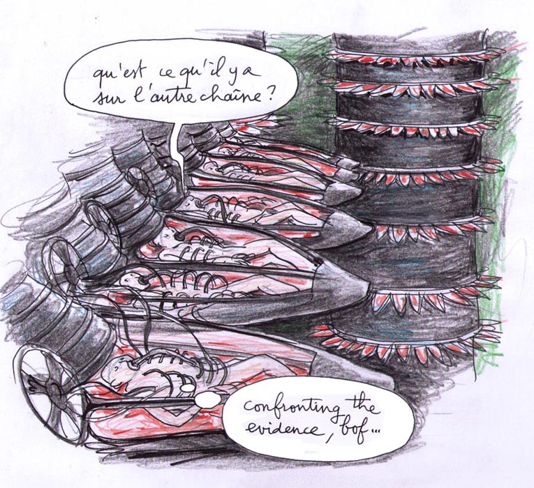 Des milliards d'être humains et des millions dans notre pays, retournèrent se rendormir consommer des rêves artificiels dans leurs baignoires individuelles emplies de gelée rosâtre. Aucun écho dans notre presse, au point que j'ai jugé inutile, comme pour d'autres sujets, de tenter de réveiller mes lecteurs, décidant de concentrer le peu d'énergie qui me restait, à 75 ans, sur les dangers du nucléaire. C'en est au point que la revue inrockuptible m'a envoyé récemment une jeune journaliste, venue enquêter sur " les conspirationnistes ", dont je faisais partie, disait-elle ( elle s'était fondée sur la "vox populi" des forums internet ).