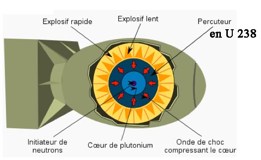 *- Le tout est placé au centre d'une charge de fusion ( deutérure de lithium ). Si le système peut fonctionner sans l'enveloppe d' U 238, on obtient une bombe 100 % propre, une bombe verte. *