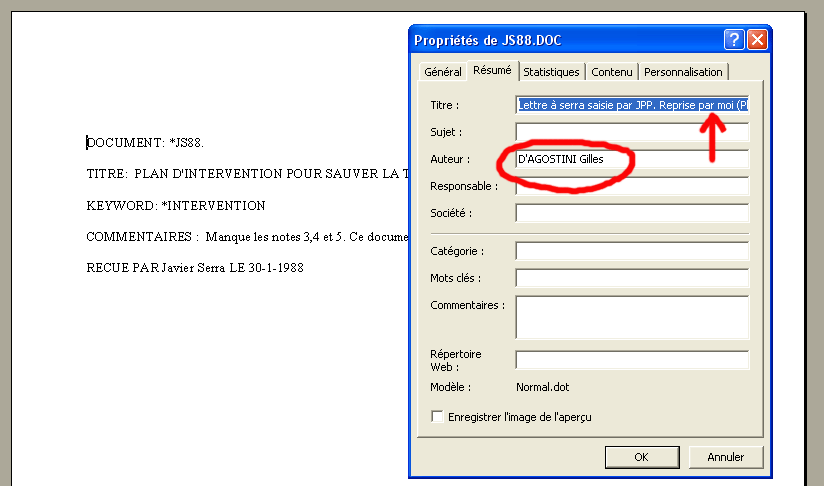 Mais nos vaillants informaticiens n'y avaient simplement pas pensé. Serait-ce à dire que d'Agostini aurait souhaité mettre son copyright sur ces documents ? Non : à moins qu'on ne spécicifie un nom d'auteur dans ce champ, Word inscrit automatiquement, par défaut, le nom qui a été déclaré en tant qu'tilisateur de ce logiciel.