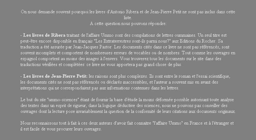 Concernant la fidélité aux textes originaux, qui semble être la pierre de touche d'Holbecq, chose à laquelle il tente de se réccrocher il manque à ummo-sciences *des éléments indispensables : les textes en espagnols, traités par OCR, en format-texte, *joints à chaque page traduite, pour que des bilingues puissent en faire progresser la compréhension. Au lieu de cela le webmaster du site nous propose des scans difficilement lisibles, frappés par un tatouage imbécile. C'est ce que nous essayerons de joindre dans le site en cours de création. Il reste énormément de travail à faire dans ces textes, qui nécessite un retour très pointus sur certaines expression, certains mots.