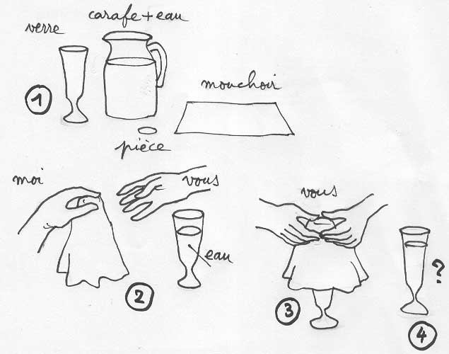 Autre "expérience". Je prends un verre à pied. Je vous demande de le prendre et de bien l'examiner. Il n'est pas truqué. Vous allez vous-même prendre une carafe d'eau dans votre placart que vous remplissez avec l'eau de votre propre robinet. Je ne touche à rien et je me tiens à distance. Je vous demande de sortir votre mouchoir de votre poche et une pièce de monnaie qui vous appartient. Alors je mets la pièce sous le mouchoir et je vous tends le tout. Je vous demande de mettre cette pièce, placée sous le mouchoir, au dessus du verre. Je me tiens à distance et je vous demande de lâcher la pièce. Vous entendez le tintement qu'elle produit en tombant au fond du verre. Je vous demande d'enlever le mouchoir. Vous le faites et ... la pièce a disparu. Je vous demander de vider l'eau. Vous la videz : rien. Je vous demande de casser le verre. Vous le faites et on ne retrouve par terre que des débris de verre.