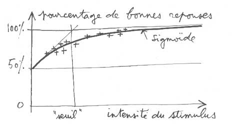 Tout ceci correspond à ce qu'on appelle "la théorie du signal". En supposant que la non-perception du signal soit liée au fait que celui-ci soit noyé dans "un bruit de fond gaussien", la courbe théorique, ci-dessus, a alors la forme de ce qu'on appelle une sigmoïde (exercice simple pour des taupins).