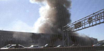 Des photos de la région de l'impact ont été prises peu de temps après. On dispose également d'une vidéo. Il y a d'abord eu une explosion. Meyssan et son équipe font remarquer que les images recueillies ne cadrent pas avec une inflammation de kérozène. Faisons une digression en considérant une image prise après un des deux impacts sur les Twin Towers. La tour, de 65 mètres de large, est construite autout d'un pilier central, sorte de cage de béton qui contient des piliers d'acier. Pour obtenir les destructions constatées il fallait que les appareils arrivent à perforer les parois de béton de cette cage. Avant cela il n'y avait pas d'obstacle particulier. L'avion est entrée dans la tour, à la hauteur d'un étage "comme dans du beurre". Ses tôles se sont déchirées, libérant cent tonnes de kérosène. Celui-ci a été projeté vers l'avant par inertie, avec les débris déchiquetés de l'appareil. Sur la photos que l'on voit ci-après ces sont ces dizaines de tonnes de kérosène qui s'épanchent dans le vide, tout en s'enflammant. Les parties noires montrent du kérosène qui ne s'est pas encore enflammé. L'inflammation de toute cette masse de kérosène qui, de plus, a besoin de l'oxygène de l'air pour entrer en combustion prend un certain temps. Le dégagement de chaleur n'est pas instantanné. Donc l'effet d'ascendance ne se manifeste pas immédiatement et comme on peut le voir ce kérosène retombe en pluie vers le sol, tout en s'enflammant. La flamme est jaune, ce qui n'est pas le signe d'une très forte température.