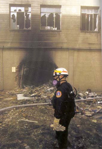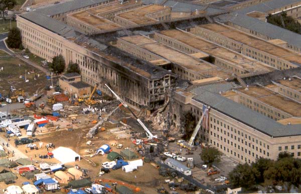 Le Pentagone. Point d'impact avec partie du bâtiment effondrée sous l'effet de l'incendie
