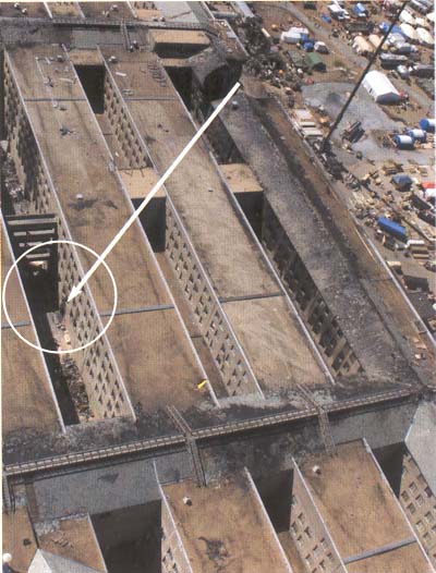 On distingue donc dans le rond l'orifice de sortie et en haut et à droite le point d'impact avec toute la partie effondrée, ravagée par l'incendie. La flèche indique la trajectoire suivie. L'effondrement, qui s'est produit une demie-heure après l'impact, nous permet de discerner la structure en coupe du bâtiment qui comprend deux pièces et deux couloirs.