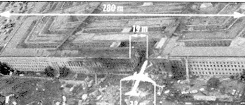 Sur la photo ci-après les enquêteurs ( DOD, département de la Défense, Tech. Sgt. Cedric H. Rudisill) ont fait figurer, comparativement, la silouhette de l'avion à l'échelle et le bâtiment, en arrière-plan (dans ce dessin l'attitude de l'avion n'est pas conforme à la version officielle du département de la défense, qui est indiquée dans le dessin suivant):