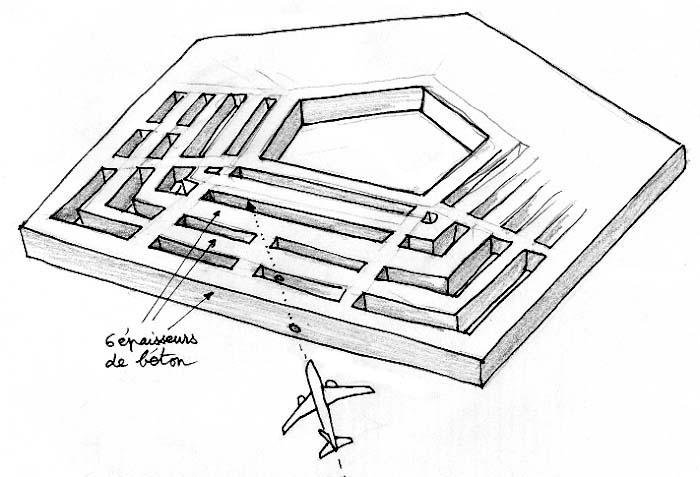 C'est un trou parfaitement rond, de 2,3 mètres de diamètre. La thèse officielle indique qu'un avion de ligne Boeing 757 aurait été le responsable de tels dégâts.