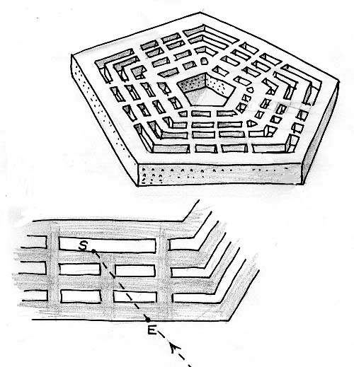 Sur le dessin ci-après, une vue d'ensemble du Pentagone, schématique. On a fait figurer la trajectoire. E : point d'entrée, S, point de sortie, au niveau de la troisième cour intérieure.