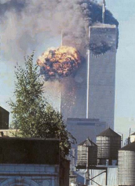 **L'avion vient de percuter la tour qui est au premier plan. Jaillissement du kérosène, qui s'enflamme. **