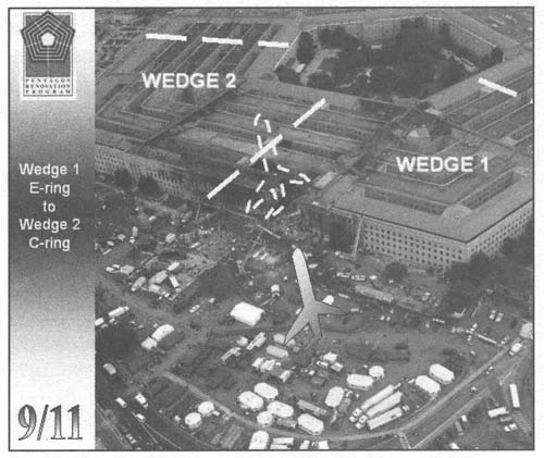 Pour que la recon,stitution soit valable il faudrait d'abord qu'un appareil aussi encombrant (38 mètres d'envergure) puissse opérer son approche sans endommager les obstacles qui sont sur sa course. L'avion s'écraserait sur la facade, à laquelle il causerait sans doute quelques dommages, mais une foule de débris divers se trouveraient immédiatement éparpillés en voletant tout autour de la zone d'impact. Lee Evey, chef de l'opération de rénovation du Pentagone a expliqué avec méthode, lors d'une conférence de presse tenue le 15 septembre (livre de de Thierry.Meyssan, page 55) comment l'appareil avait pénétré dans le bâtiment et comment il avait successivement percé toutes ses cloisons.
