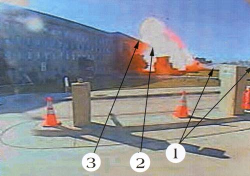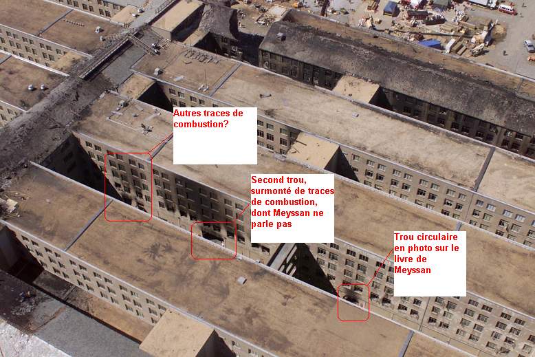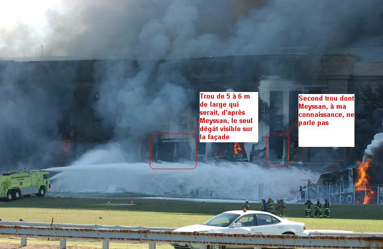 Cette photo demande à être commentée. Je conserve les idées suivantes. Le Pentagone est une construction peu élevée '23 mètres). Le ou les points d'impact sont très près du sol, ce qui implique une approche rasante, pour un appareil qu'on voit mal réaliser cette approche volets sortis. Volets rentrés ce 747 devait donc volert à 450 km/h. Difficile à piloter à un ou deux mètres du sol. A éclaircir. Par ailleurs on ne sait pas quand cette photo a été prise exactement. Ce qu'on sait c'est que l'explosion ne s'est pas encore produite, puisqu'elle a éventré le bâtiment. Par compte ça flambe à l'intérieur, entre les deux ouvertures dont l'une peut n'être qu'une simple fenêtre soufflée. Ceci étant, comme l'explosion ne s'est pas encore produite, dans ces bâtiments stagne une "mer de kérosène" correspondant au remplissage d'un appareil chargé à bloc. On voit mal ce kérosène "brûlant en deux fois".