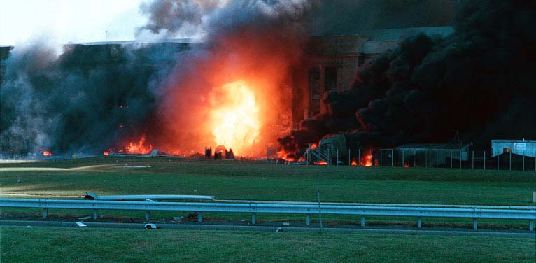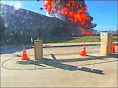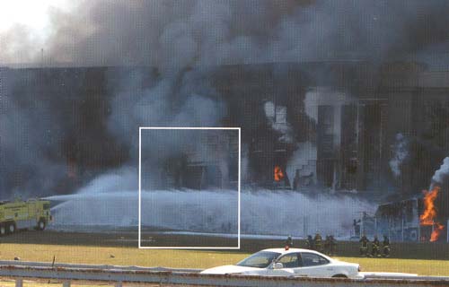 Ce cliché, mis en vente par une agence de presse Américaine est très intrgant. Est-ce un instantané sur une explosion ? De toute façon, ca émet sec. Si c'était un incendie j'imagine que la pelouse qui est juste devant le Pantagone aurait du roussir à cause du rayonnement. A droite ce qui est décrit "comme un camion de pompier en stationnement devant le bâtiment" brûle. Donc c'est avant l'arrivée des pompiers, qui l'ont éteint. Voir clichés 1, 12 et 13. Il n'y a pas beaucoup de débris devant le bâtiment. Le Boeing 757 se serait alors déjà réduit en fragments d'alliage léger de petite taille ? La direction des fumées du camion qui brûle donne la mesure de la direction du vent qui soufflait ce jour-là. A-t-on des confirmations météo ? Difficile de voir à quoi correspondent les objets visibles au premier plan, devant la lueur. Il faudrait pouvoir avoir en main le cliché de l'agence, qu'elle vend. Enfin, dernière remarque : il y a eu explosion du kérosène dont l'appareil était bourré, trente minutes après ce cliché, grosso-modo. Il faut donc admettre que postérieurement à ce cliché montrant une boule de feu le kérosène, qui aurait fait explosion dans le bâtiment situé au premier plan ne serait pas enflammé, en restant tranquillement à quelques mètres en arrière de cette boule de feu. Etrange carburant....