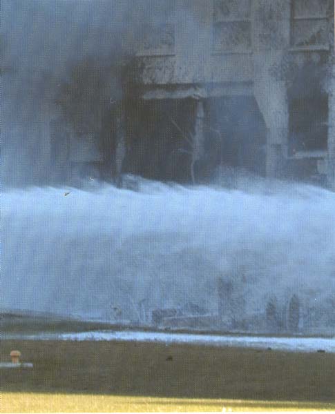 Sur le cliché suivant, un agrandissement de ce trou présenté comme le point d'impact. C'est un cliché très intrigant. En effet l'orifice semble être de forme rectangulaire. On distingue les fenêtres au dessus et sur les côtés. La partie supérieure semble être un élément d'un plancher. Le trou couvre l'espacement de deux fenêtre et est donné comme ayant 5 à 6 mètres de large. C'est ce qui correspondrait à un mur qui aurait été défoncé. Devant, le jet d'eau correspondant à l'arrosage du camion en feu. On ne sait pas exactement ce qui apparaît au milieu du trou. Est-ce une cloison vue par la tranche ou un fragment de poutre qui pendrait ?